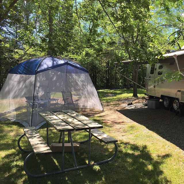 In other news … the heat has broken here in the southeast part of the state and now the bugs are out in full force. Having been cooped-up for too many days in air conditioning, I was anxious to work outside while enjoying this nice campsite (electric only). So, in an attempt to level playing field with pesky bugs I purchased this screen room last night ($45 at Walmart).